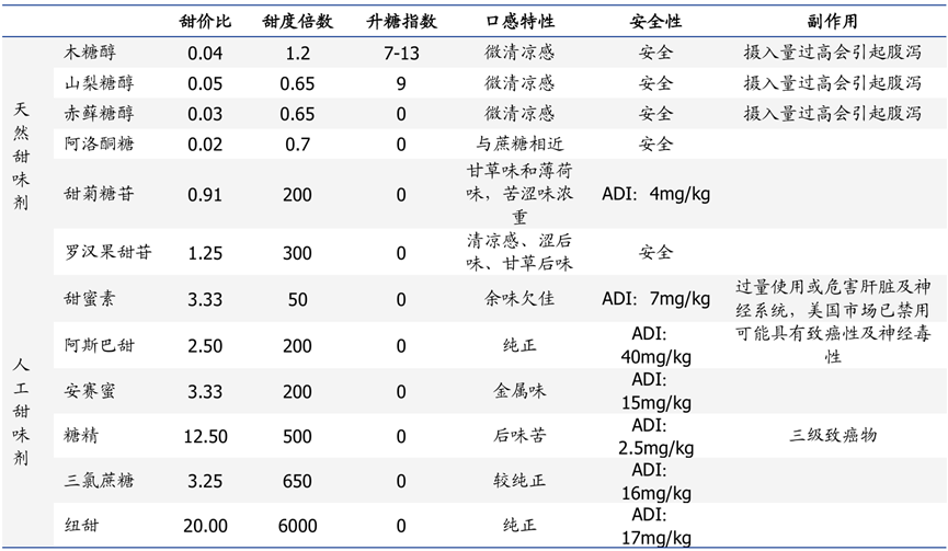 目前食品工业中代糖产品种类繁多,代表性产品有山梨糖醇、木糖醇、赤藓糖醇、阿斯巴甜、安赛蜜等。据华经情报网数据显示,木糖醇和山梨糖醇对血糖具有一定升糖作用,其他天然甜味剂、人工甜味剂产品,基本不会造成人体血糖升高。从代糖的安全性来看,赤藓糖醇、阿洛酮糖和罗汉果甜苷是具有较高安全性的代糖。不过一般代糖产品在使用中都需要严格控制添加比例,并且需要符合当地对于代糖的添加要求。