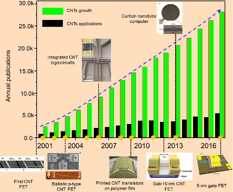 2012年,实现了10 nm沟道宽度的碳纳米管晶体管的构建;