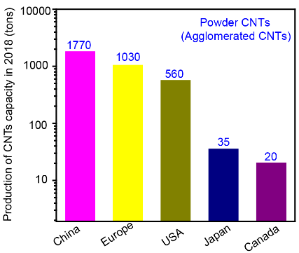宏量制备能够推动碳纳米管材料走向实用化,图9a给出了碳纳米管在各个国家的产量分布情况。