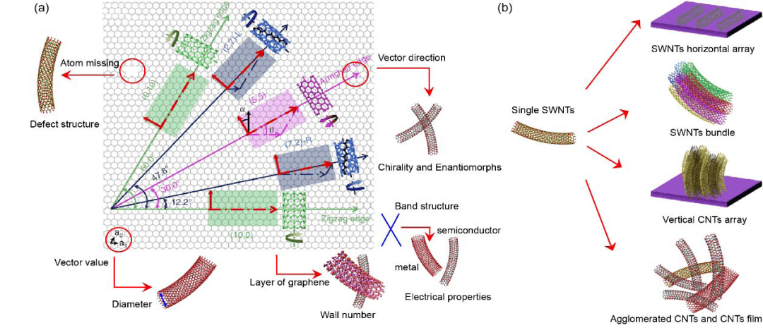 图1 碳纳米管精细结构分类(a)以及以碳纳米管为基本单元构建的宏观聚集体(b)