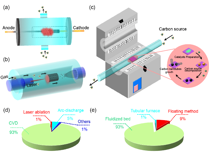 目前通过化学气相沉积法,可以实现碳纳米管水平阵列、薄膜、竖直阵列等的可控制备。化学气相沉积法对应的量化生产设备包括流化床和浮动催化生长体系等。