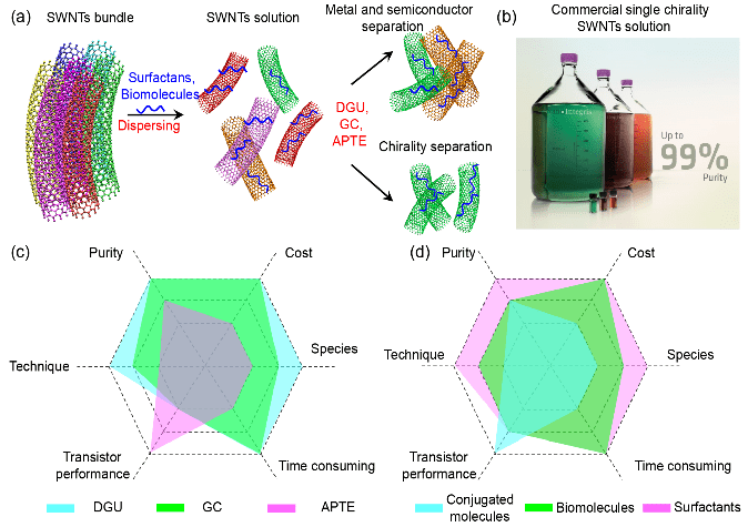 图5 (a)溶液法分离碳纳米管的一般流程以及(b)商业化高纯度碳纳米管溶液;(c)和(d)分别为不同分离方法和不同分子对碳纳米管分离的效果等的比较