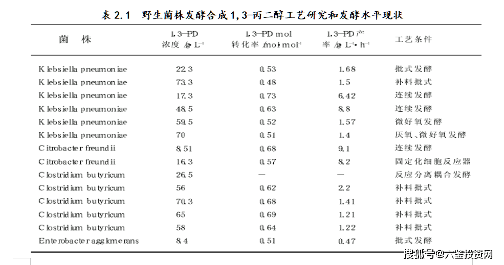 表2.1 野生菌株发酵合成1,3-丙二醇工艺研究和发酵水平现状