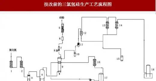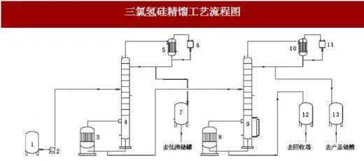 三氯氢硅生产主要有3个工序:三氯氢硅合成、三氯氢硅精馏、尾气处理。