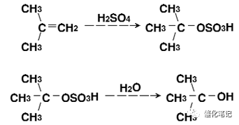 异丁烯间接水合法是传统的生产方法,使用45%~65%硫酸为催化剂,以抽提丁二烯后的C4馏分为原料,使其中的异丁烯发生水合作用生成叔丁醇。异丁烯反应活性高于正丁烯,用50%硫酸对iC4=具有良好的选择性,它与nC4=反应速度只为iC4=的1/60,所以异丁烯与硫酸水合反应很快。反应条件为5~20℃,0.7MPa。通常是将抽提丁二烯后的含有1-丁烯、2-丁烯、异丁烯、丁二烯和丁烷的C4馏分先用50%硫酸进行萃取,使其中的异丁烯与硫酸酯化生成硫酸异丁酯,再将硫酸异丁酯水解生成稀叔丁醇,再经浓缩、提纯得到叔丁醇。异丁烯的转化率达99%。