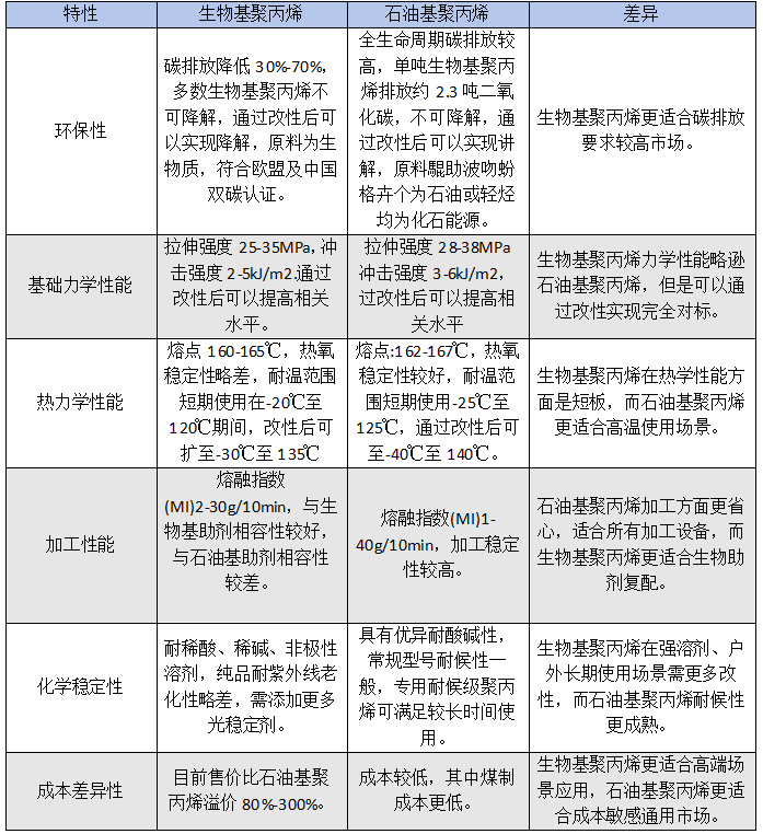 表1 生物基聚丙烯与石油基聚丙烯在材料特性应用差异对比