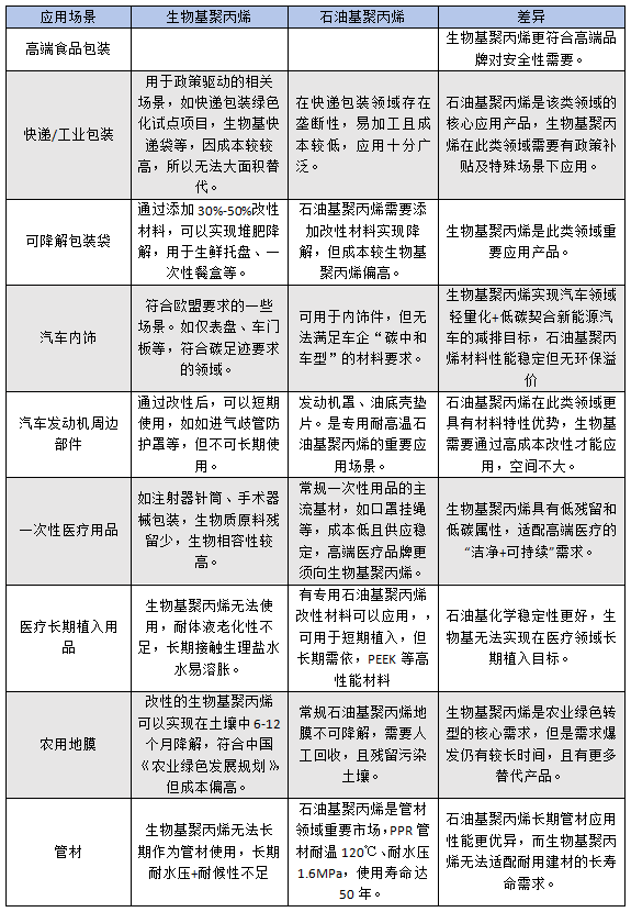 表2 生物基聚丙烯与石油基聚丙烯在不同应用场景下对比